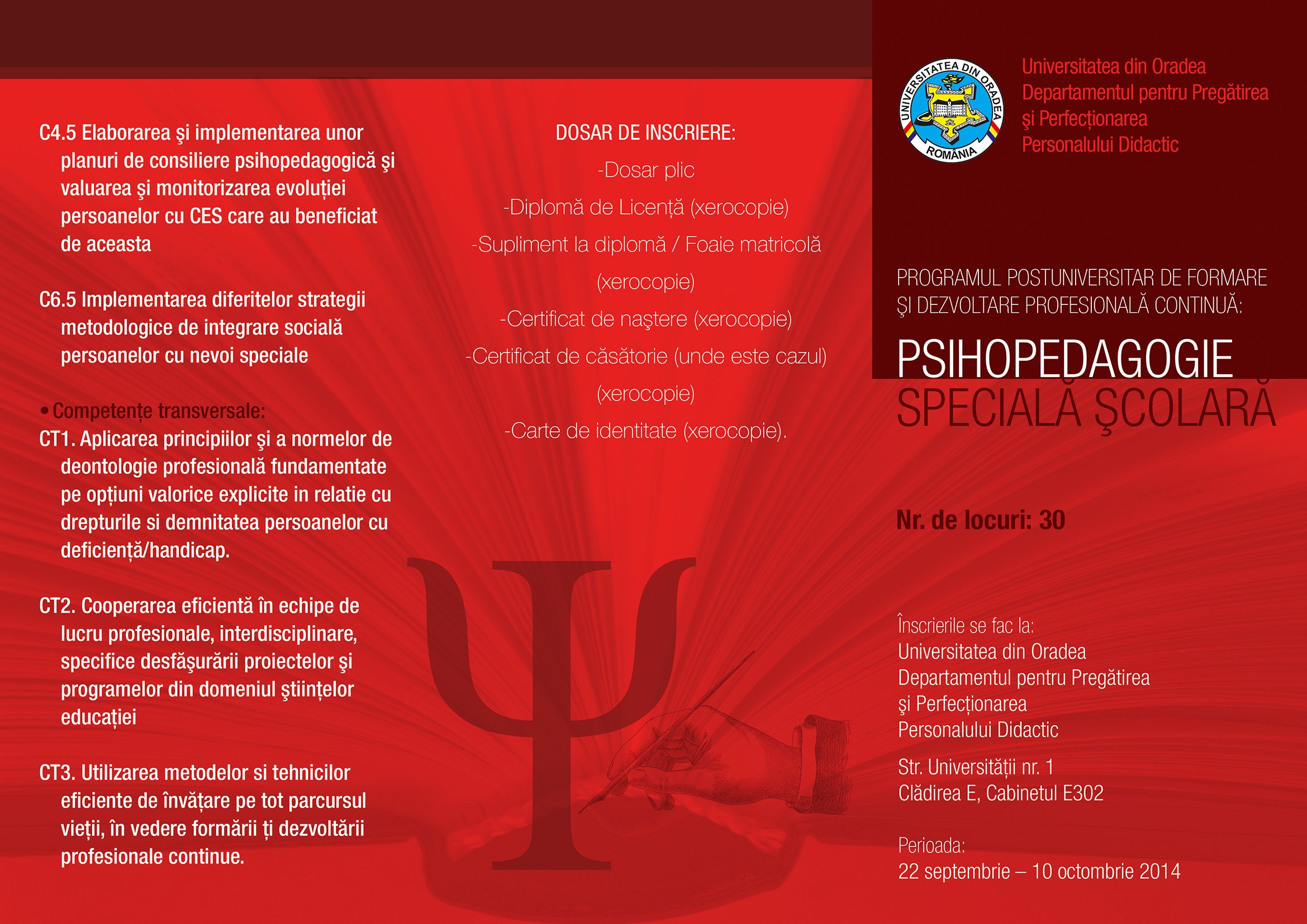 PERIOADA DE ÎNSCRIERI: 5 septembrie 2017 – 30 septembrie 2017 între orele 10-14 Clădirea E, etajul III, sala E 302